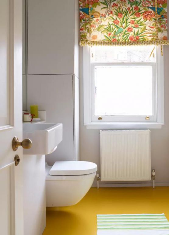 誰說拼色只是為了時(shí)尚?在這個(gè)小衣帽間里也很有效。簡(jiǎn)潔是關(guān)鍵,引人注目的黃色地板從白色背景和浴室套房中突顯出來