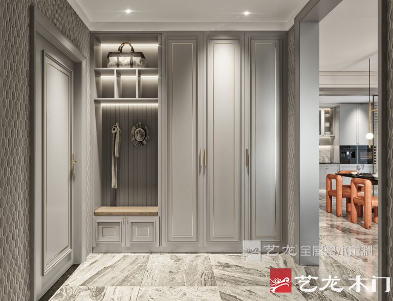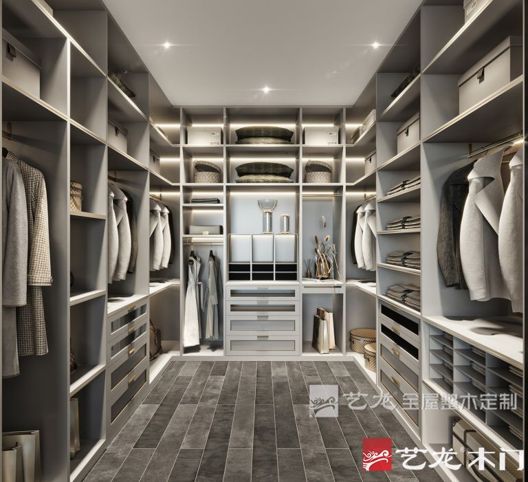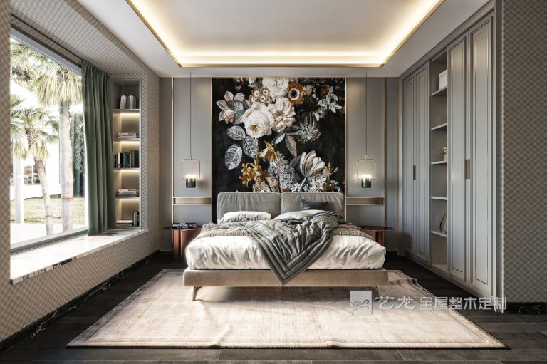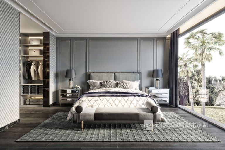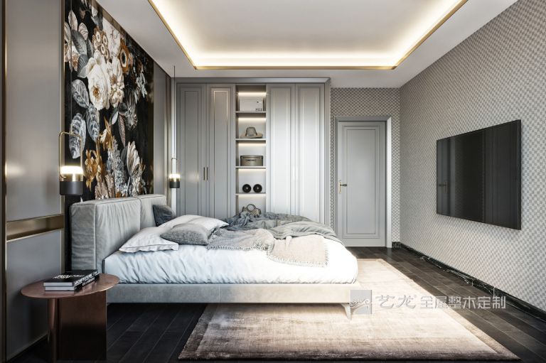 臥室的整個(gè)墻面是淺灰色,床品、軟裝也是灰白色的,搭配淺灰色的衣柜、床頭柜等家具,整個(gè)臥室看起來(lái)非常輕松和舒服。