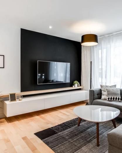 如果您想跳過墻板,同時(shí)仍然幫助您的電視“融入”空間,那么涂漆的黑色裝飾墻是一個(gè)不錯(cuò)的選擇。雖然您不會(huì)得到任何帶有榫槽鑲板或黑色木板條墻鑲板的紋理,但您將獲得干凈、簡(jiǎn)約的外觀和強(qiáng)烈的對(duì)比。