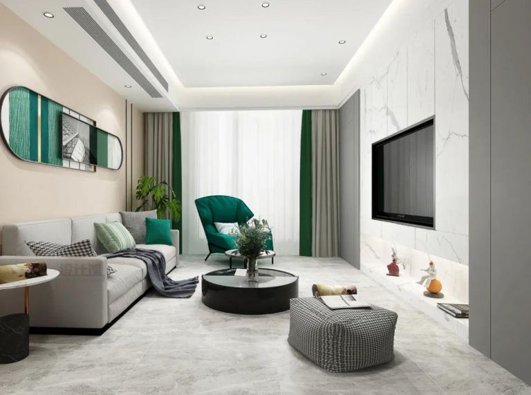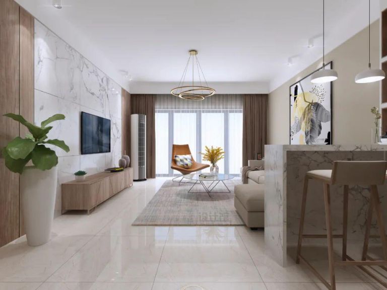 在比較現(xiàn)代風(fēng)的空間中,也可以在電視墻加入大理石的背景墻設(shè)計(jì),同時(shí)在兩側(cè)加入對(duì)稱的木飾面材質(zhì),也可以增加空間的自然舒適,避免大理石質(zhì)感帶來的單一冰冷感受。