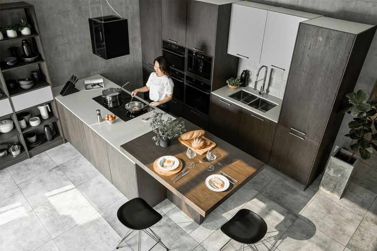 工字形廚房,廚房半島與餐桌和定制照明相結(jié)合,不僅有助于促進(jìn)放松,還可以減少照射在居住者臉上的光線,將注意力吸引到食物上。如果沒有足夠的光線,即使是精心設(shè)計(jì)的房間也會(huì)顯得沒有吸引力和乏味。