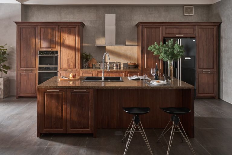 深色木紋的天然實木廚柜適用于明亮的廚房。無論風格是現代還是經典,深色木質廚房都是永恒的選擇,將為您的廚房帶來一定的優(yōu)雅。深色廚柜看起來時尚、神秘和高檔。